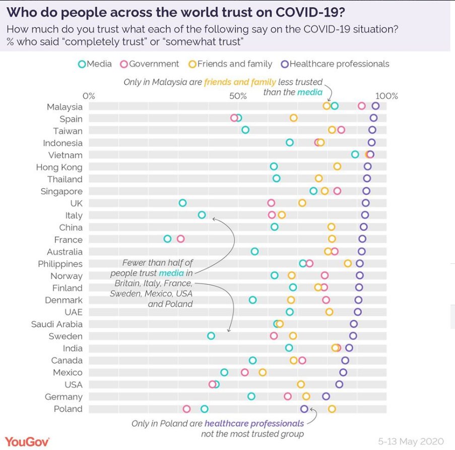 Wydaje mi się, że o logiczną odpowiedź bardzo tu łatwo. Jest to problem natury socjologicznej, którego rozwiązanie znajdziemy dokładnie w tym samym wykresie... Zauważ, że mamy trzeci najniższy poziom zaufania społecznego do mediów oraz najniższy w całym tym wykresie poziom zaufania do rządu; moim zdaniem, to rzuca się w oczy jeszcze bardziej, niż fakt braku owego zaufania w stosunku do lekarzy.